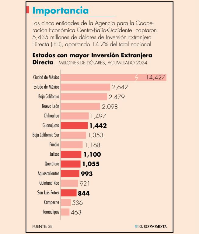 En el 2024, las cinco entidades de la agencia captaron 5,435 millones de dólares de Inversión Extranjera Directa, aportando 14.7% del total nacional, según la Secretaría de Economía.