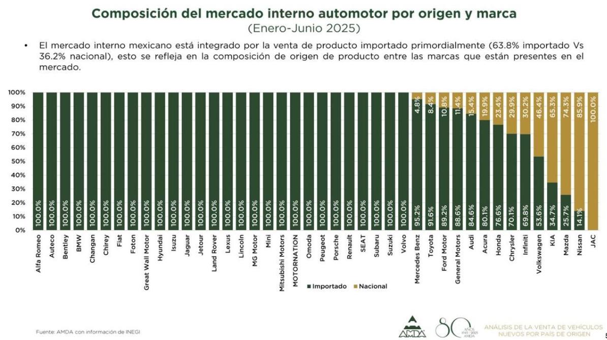 En un contexto donde la mayoría de los vehículos comercializados en México son importados, JAC México, producción nacional y AMDA se combinan en una estrategia que posiciona a la compañía como la única marca con el 100% de su producción nacional. De acuerdo con la Asociación Mexicana de Distribuidores de Automotores (AMDA), actualmente casi dos de cada tres autos vendidos en el país provienen del extranjero, lo que marca un contraste con la estrategia de la compañía.